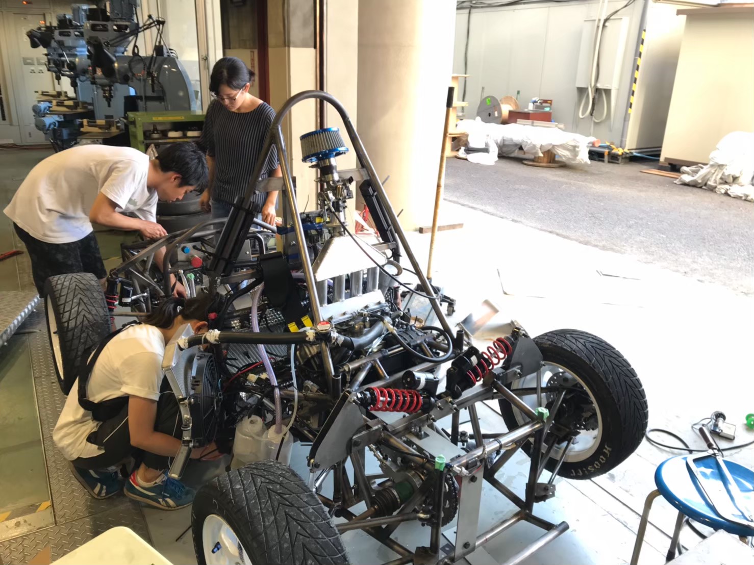 学生フォーミュラでは学生版のF1(レーシングカーの一種)の設計・制作・運転を全て自分たちの手で行い、毎年夏に行われる大会に参加しています。基本的な活動場所は南大沢キャンパス9号館地下の工作施設です。車に関しての知識がない人、文系の人も大歓迎です!